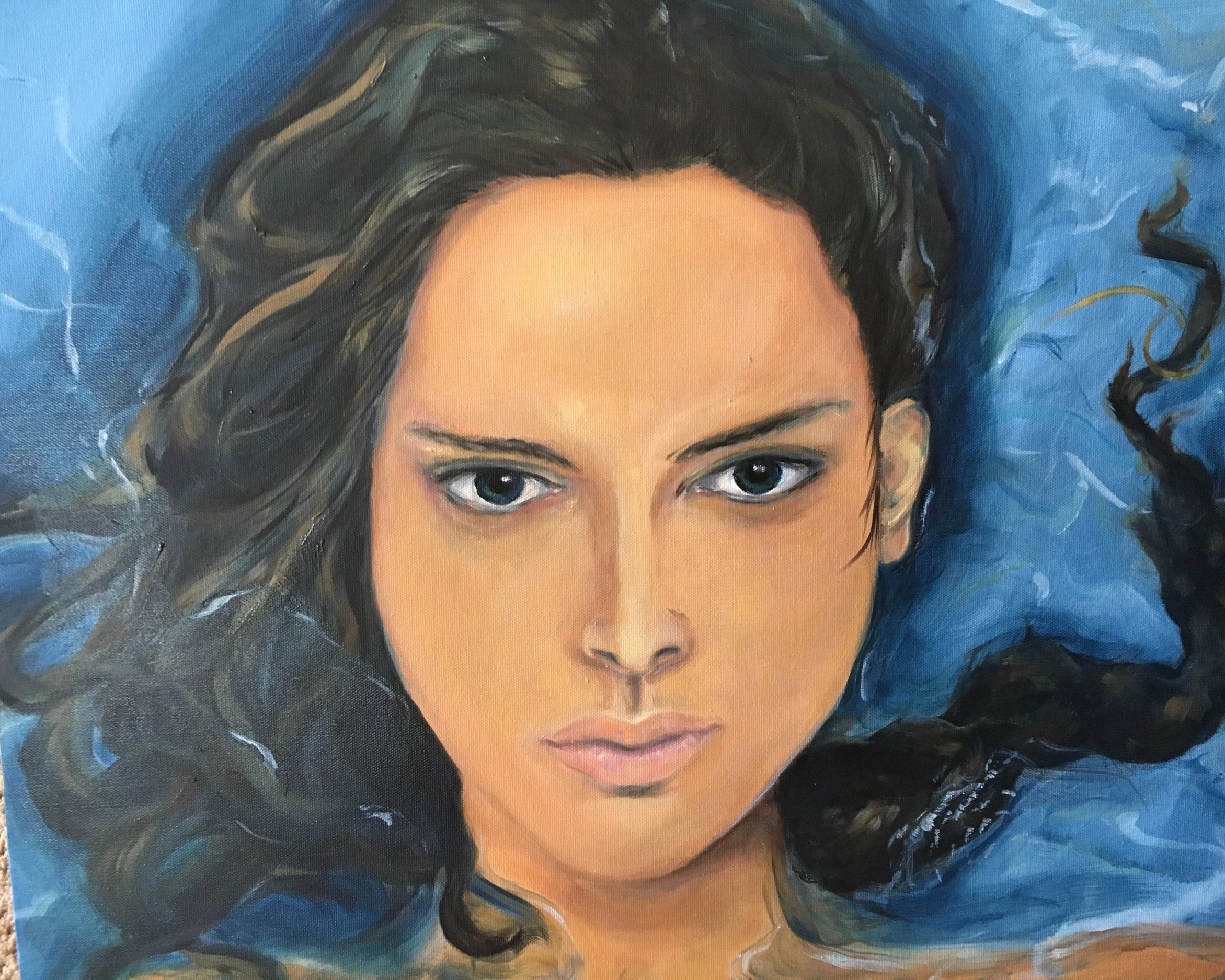 A painting of a woman with piercing blue eyes, dark hair, prominent eyebrows, and lips, wearing a light-colored headscarf.